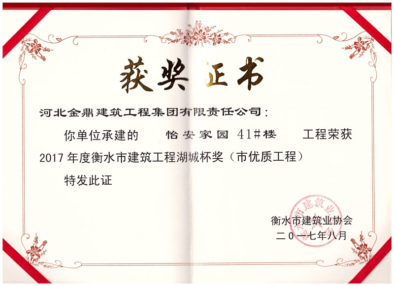 怡安家園41#樓工程榮獲2017年衡水市建筑工程湖城杯獎(市優質工程)