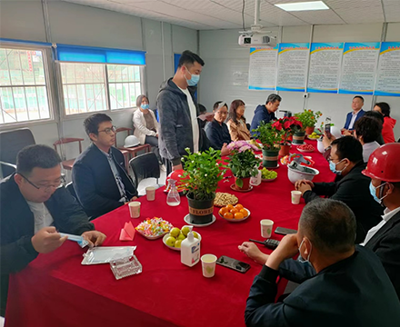 在會議室召開慶祝封頂會議,項目經理侯紅磊匯報項目施工情況,總監理工程師講話。
