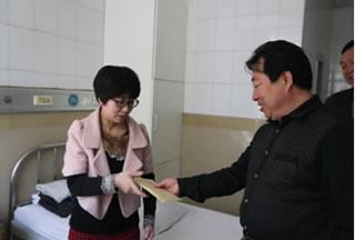 代經理及其公司代表一起到衡水市二院去看望職工姚新水愛人,并把愛心捐款親手交給姚新水愛人。